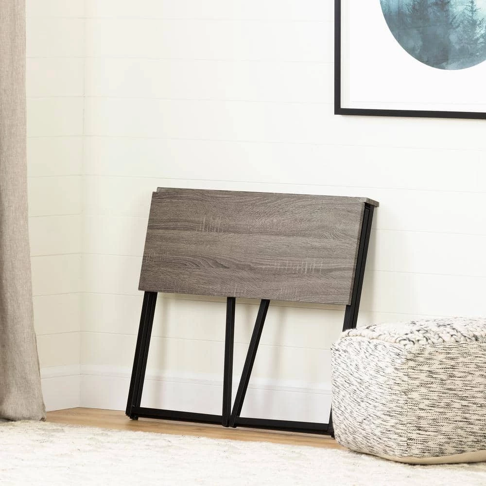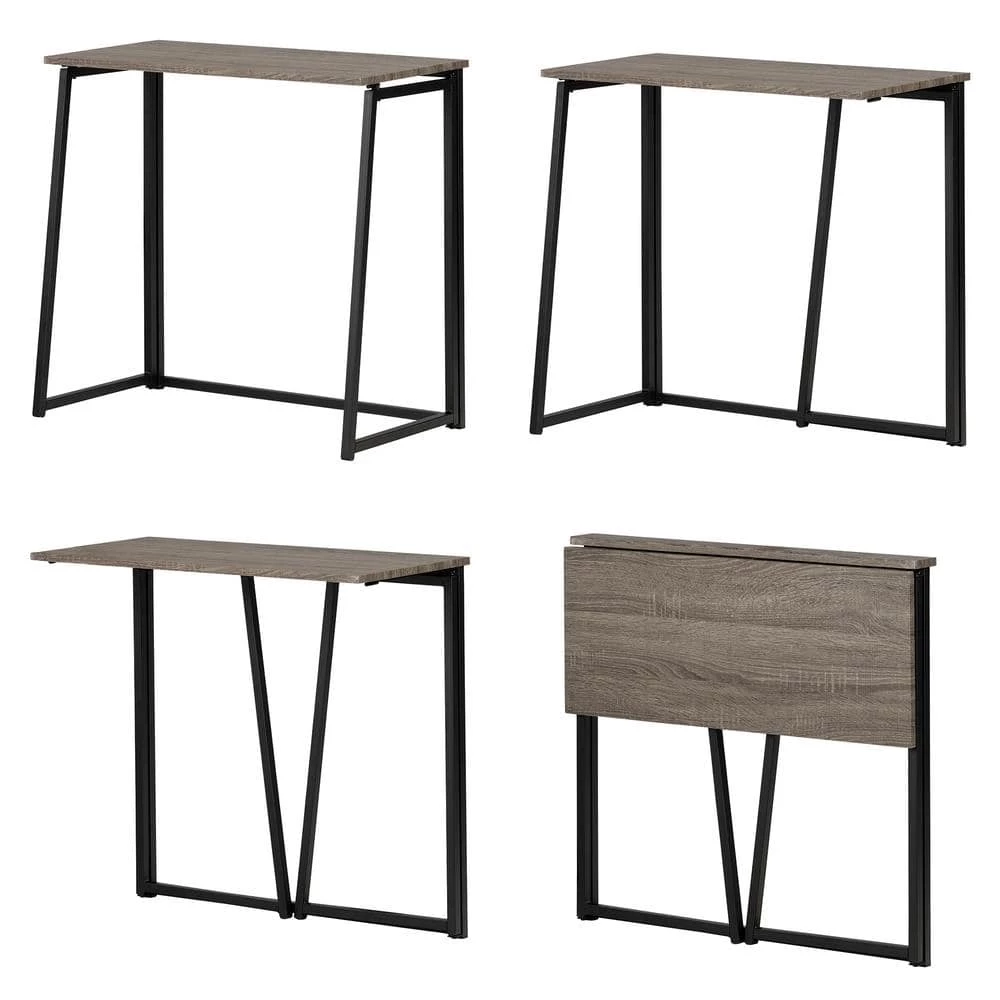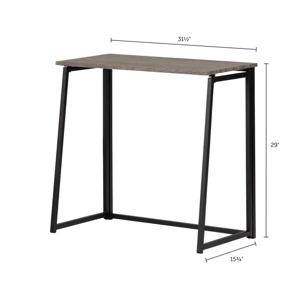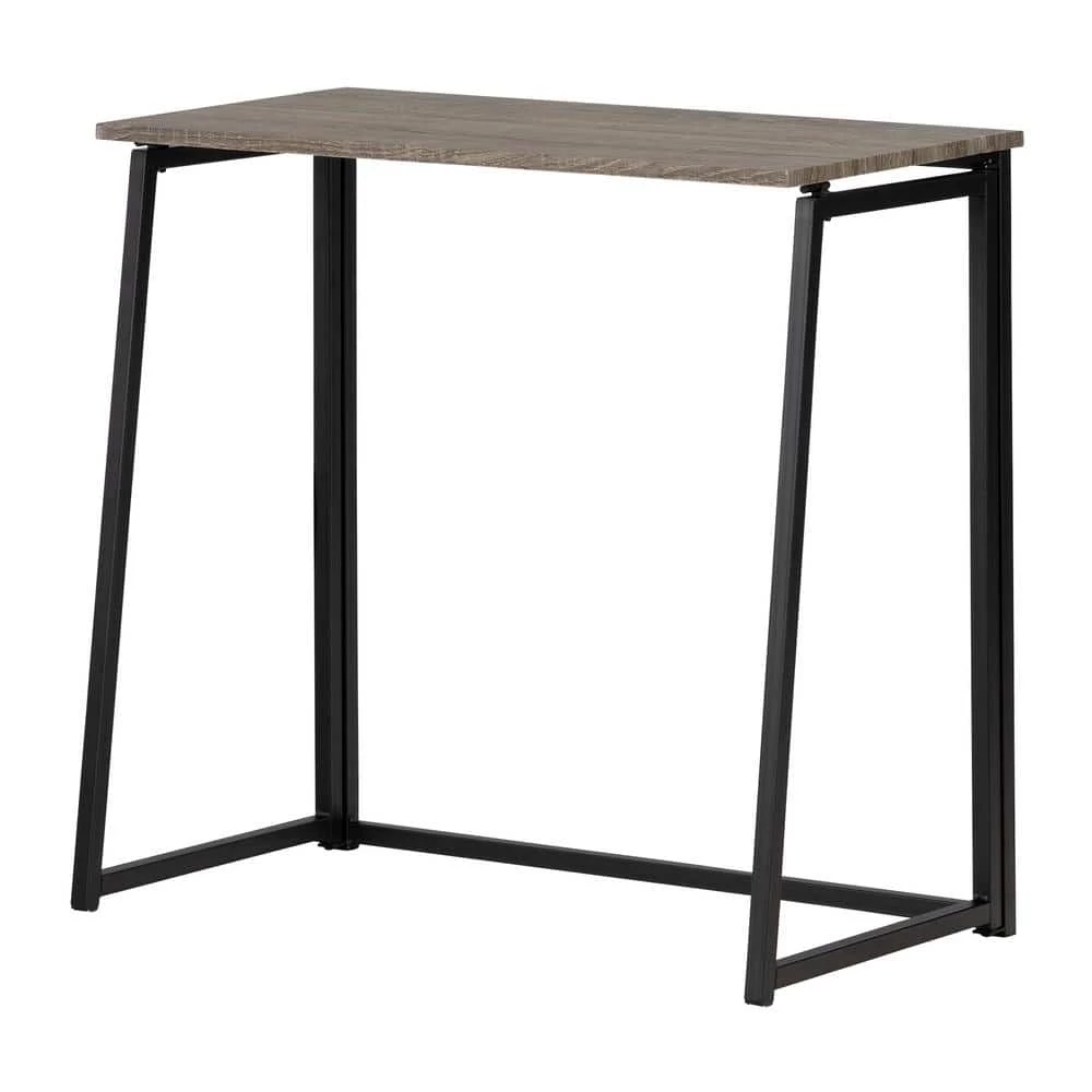 Folding Desk. This versatile little desk makes a great computer table, or even an accent table. It takes up very little space in a room and even less when its folded. How do you store it. Just fold it up: it becomes so thin, you can lean it against a wall or put it into a closet. A Minimalist Modern Look -Ideal for tight spaces. The clean lined, minimalist look of this piece means you can use the whole surface for your work. It calls to mind the old style school desks, with an up-to-date industrial-modern flavor. And everyone falls for the attractive metal legs, which add a lot of charm. Resistant Work Surface. The top is made of MDF, so you can be sure the desk is sturdy. The surface is covered in a thin layer of film, to make it water resistant. 1-year limited guarantee -South Shore is proud to stand behind this industrial folding computer desk with an exclusive 1-year limited guarantee. Shop with confidence knowing your purchase is always covered. All our products meets or exceeds North American safety standards and our packaging are tested and certified to reduce the risk of damage during shipment. This item is shipped in 1 box, make sure to have a friend with you. This product is made in China for South Shore with laminated particleboard and Metal. Accessories not included.