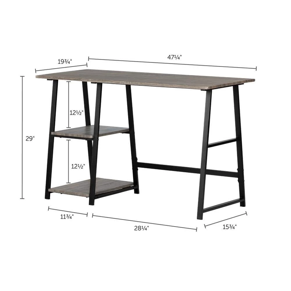 Workstation with Shelves. This computer desk will be great in your home. You get open storage with two fixed shelves. The piece, which is also not very bulky, is finished on all sides, so you can place it wherever you like in your space. Underneath Storage. The lower part, made up of 2-shelves, is perfect for small spaces like in the living room. Giving it a sturdy and modern look, you can use it for books, paperwork, or some baskets. A Handy Industrial Style Desk. This computer desk from the Evane collection gives you a large surface where you can work in comfort. And if you spill a few drops of your beverage, no worries the work surface is water resistant. 1-year limited guarantee. South Shore is proud to stand behind this industrial computer desk with storage with an exclusive 1-year limited guarantee. Shop with confidence knowing your purchase is always covered. All our products meet or exceeds North American safety standards and our packaging are tested and certified to reduce the risk of damage during shipment. This item is shipped in 1 box, make sure to have a friend with you. Assembly is required by 2 adults and tools are not included. If you have questions regarding this product or need assistance do not hesitate to contact South Shore Furniture 7 days support. This product is made in China for South Shore with laminated particleboard and Metal. Accessories not included.