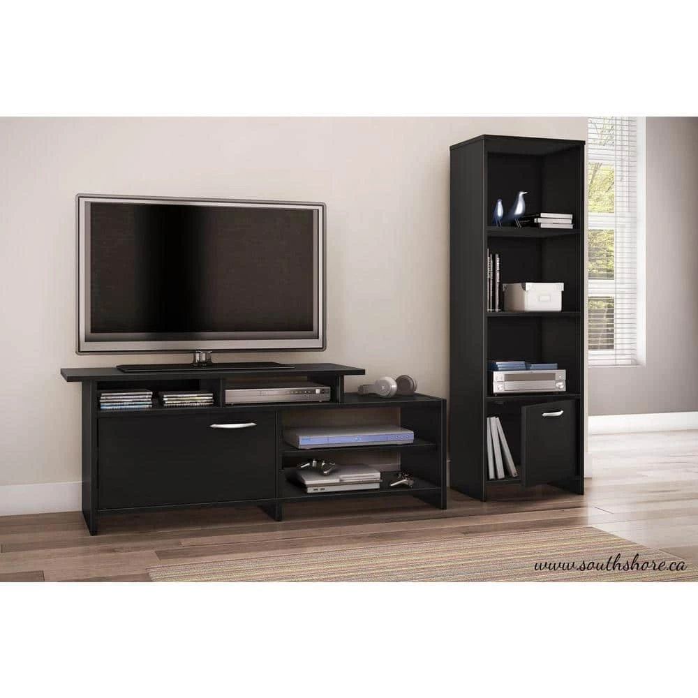 This Step One Shelf Bookcase in Pure Black features straight lines for a contemporary style. It can perform multiple functions such as the ideal media tower for holding your DVDs and game console, or simply as a handy bookcase or nightstand. It comes with 3 open, practical and accessible storage spaces, separated x 2 adjustable shelves that can support a weight up to 15 lbs. each. In addition, 1 closed storage space at the bottom concealed x a non-reversible door equipped with a Nickel Brushed metal handle. Pair it with the Step One TV Stand or bedroom items for a complete set. It is also available in chocolate finish. It measures 17-1/2-in. W x 11-3/4-in. D x 54-1/4-in. H. For complete dimensions, see spec sheet. It is delivered in a box measuring 59-in. x 13-in. x 4-1/4-in. and weighing 46 lbs. The back surface is not laminated and comes with a hole for better wire management. Accessories not included. Manufactured from certified Environmentally Preferred laminated particle panels. Complete assembly required x 2 adults. Tools not included. 5-year limited warranty. Made in Mexico.