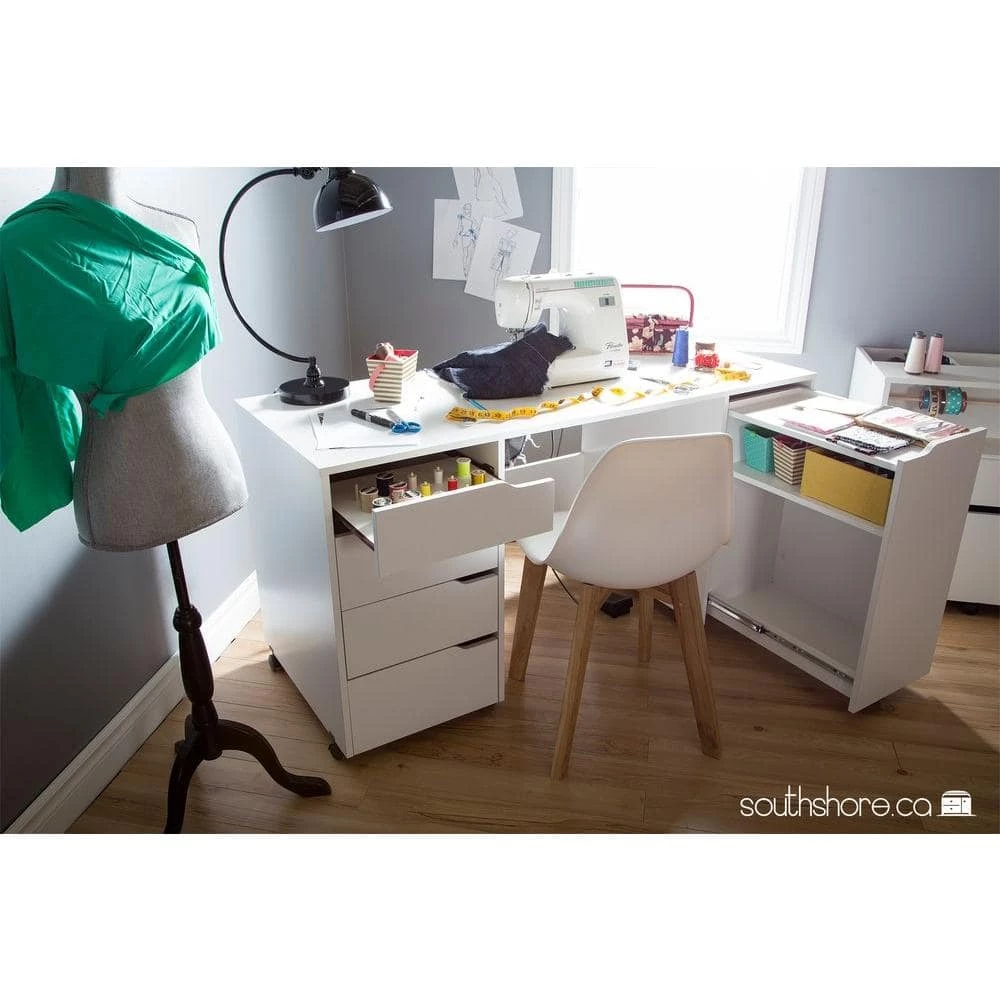 - Sliding storage module on the right features: a small work surface (top) that’s perfect for holding whatever you’re sewing, and 2 open storage spaces: the lower one is ideal for putting away your sewing machine
