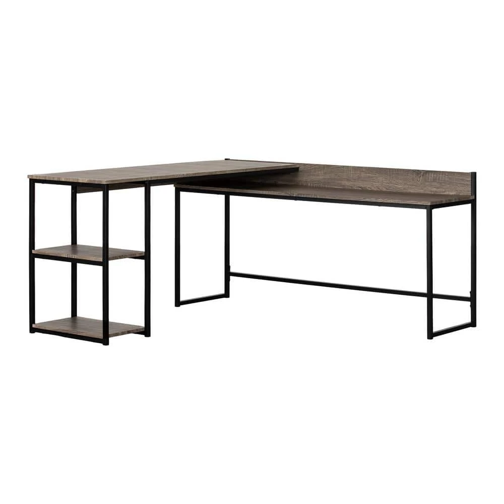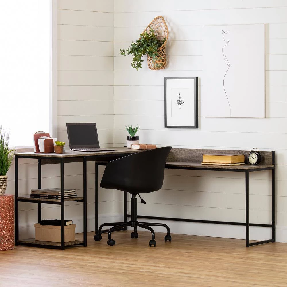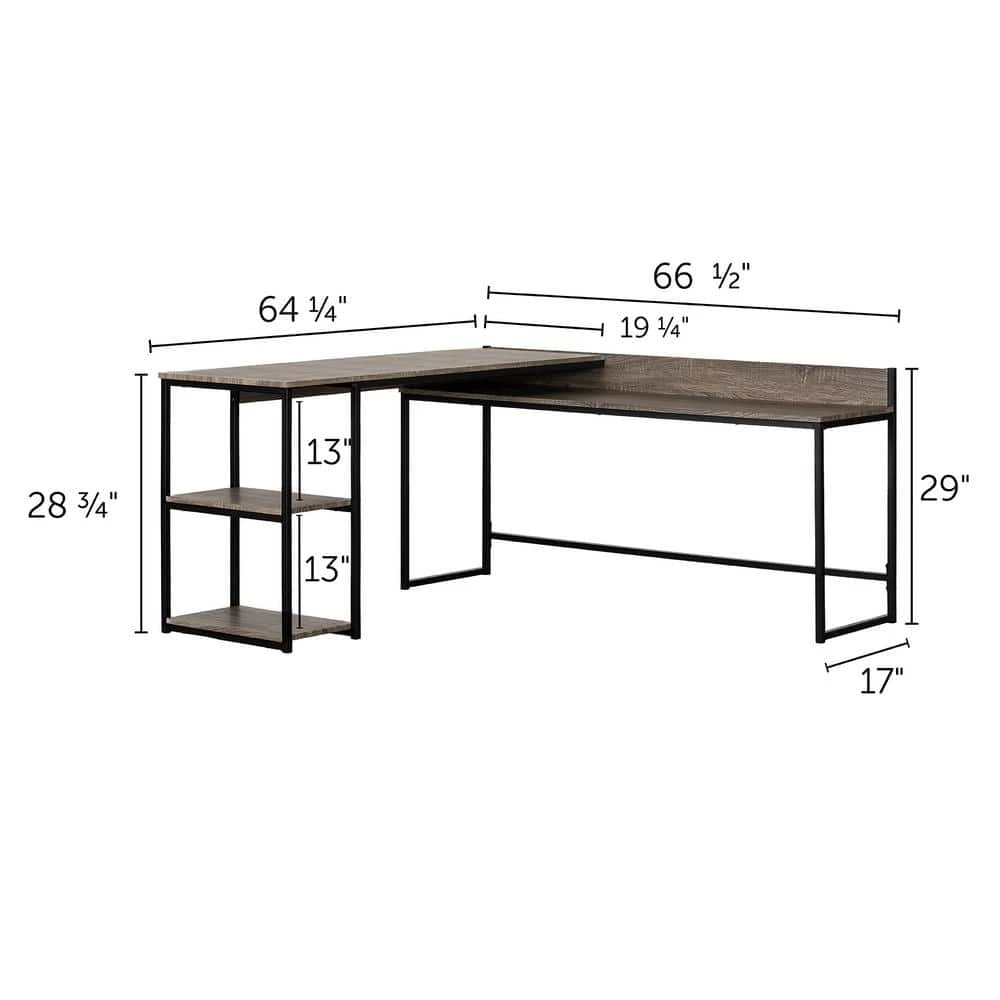 An Industrial look desk – If you work from home regularly, this Industrial desk was made for you. The L shape makes it easy to place in the corner of any room, and it’s very functional. We love the contrast between the surface and the delicate metal legs that give it a trendy, minimalist look. Practical open storage – Forget those drawers full of way too much useless stuff. This desk features two large fixed shelves to hold your books, work materials, and printer. We kept it to the bare essentials, for a tidy space where you can work more efficiently. 1-year limited guarantee – South Shore is proud to stand behind this l-shaped desk with an exclusive 1-year limited guarantee. Shop with confidence knowing your purchase is always covered. All our products meets or exceeds North American safety standards and our packaging are tested and certified to reduce the risk of damage during shipment. This item is shipped in 1-box, make sure to have a friend with you. Assembly is required by 2-adults and tools are not included. If you have questions regarding this product or need assistance do not hesitate to contact South Shore Furniture 7-days support. This product is made in China for South Shore with metal and PVC. Accessories not included.