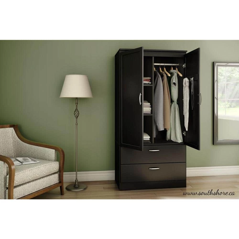 This Acapella Pure Black Wardrobe is a great addition for any room that requires more storage spaces whether it’s in the entryway, the bedroom or even the family room. Its framed doors, streamlined drawers and elegant nickel finish metal handles will give you a transitional style that fits to any decor. It features 3 storage spaces on the left side separated by 2-adjustable shelves. On the right side there is a metal rod for hanging longer item of clothing, including 2-hooks behind the door for scarves, ties and other types of neckwear. The interior dimensions of the 2 large drawers are 32 in. wide by 14-1/4-in. front to back by 5-1/4-in. D and are equipped with metal slides. Pair it with an Axess Pure Black Bookcase to enhance its versatility and optimize your space.