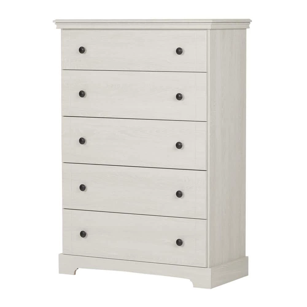 The grooves on the drawer fronts, the black metal handles, and the moldings on three sides make this chest from the Avilla collection a great example of that sought after cottage style. You’ll love its rich new finish and handy storage spaces. Metal handles in a Black finish.