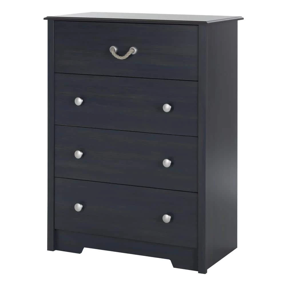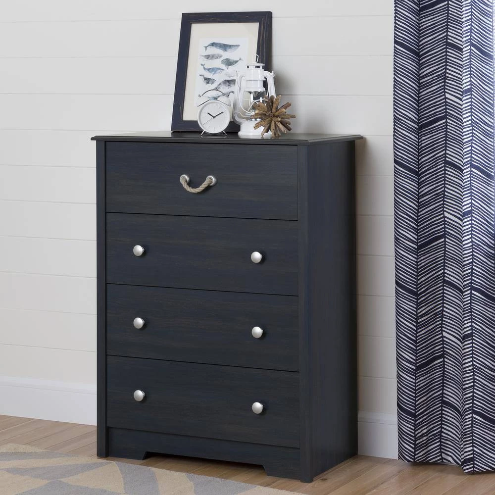 This nautical style dresser is the perfect solution for anyone with limited space as it stands upright, using a small footprint. The bottom 3 drawers are accented with silver finish metal knobs while the top drawer takes focus with the rope handle. Thanks to it’s versatility, this dresser will pair will with any traditional or contemporary furniture or design theme in any room of your home.Featuring metal slides on each drawer for quick and smooth use, accessing your belongings is a breeze. These 4 spacious drawers are perfect for storing clothing or linens, making it a great fit for any room in your home. Tidy up your space in style with the Aviron collection!