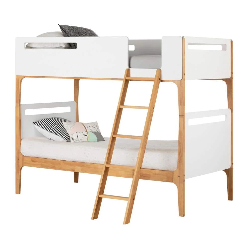 A great way to sleep 2. Your kid’s boys or girls will just love these bunk beds. They’ll spend a lot of time here and make this bed their own little nook for sharing stories. A modern Scandinavian design, this 2-tone piece, in neutral colors with straight lines, was inspired by the Nordic style. The small openings in the panels, which act as guardrails, are just one of many features that give it a lightweight look even though its tall. Super-safe bunk beds for kids. The angled ladder, guardrails and wood and MDF structure all work together to make this piece safe for kids and its ASTM certified. We recommend the use of a mattress no more than 9 in. thick for these beds. Convertible bunk beds -You can also take the two beds apart and make them into a single bed and a smaller one that’ll make a great transition bed if you’re expecting a third child. This means you can reuse the lower bed later as a standard single bed in the room.