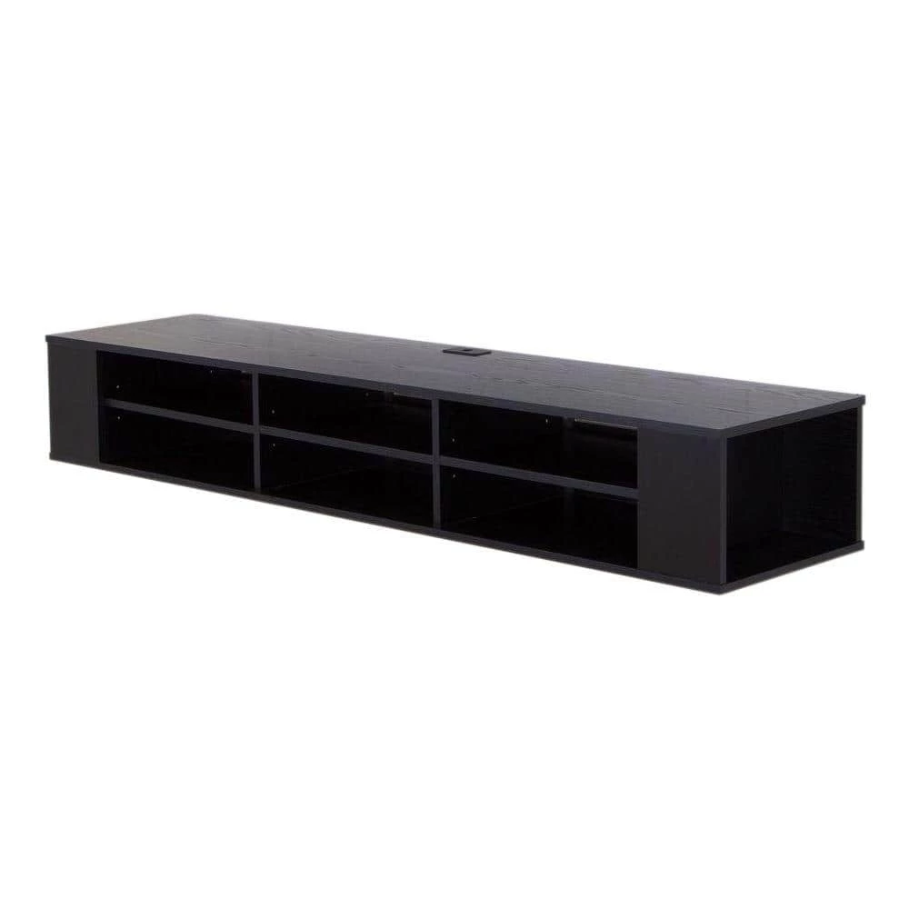This modern, designer look wall mount media console will free up space and give your living room a light, airy look. Its multiple open storage spaces and others for passing cords through, were specially designed to meet today’s electronic equipment needs. This piece will be perfect under the TV on your wall, for a truly contemporary look.