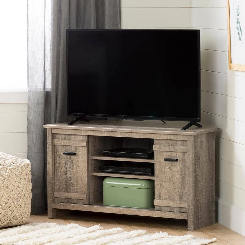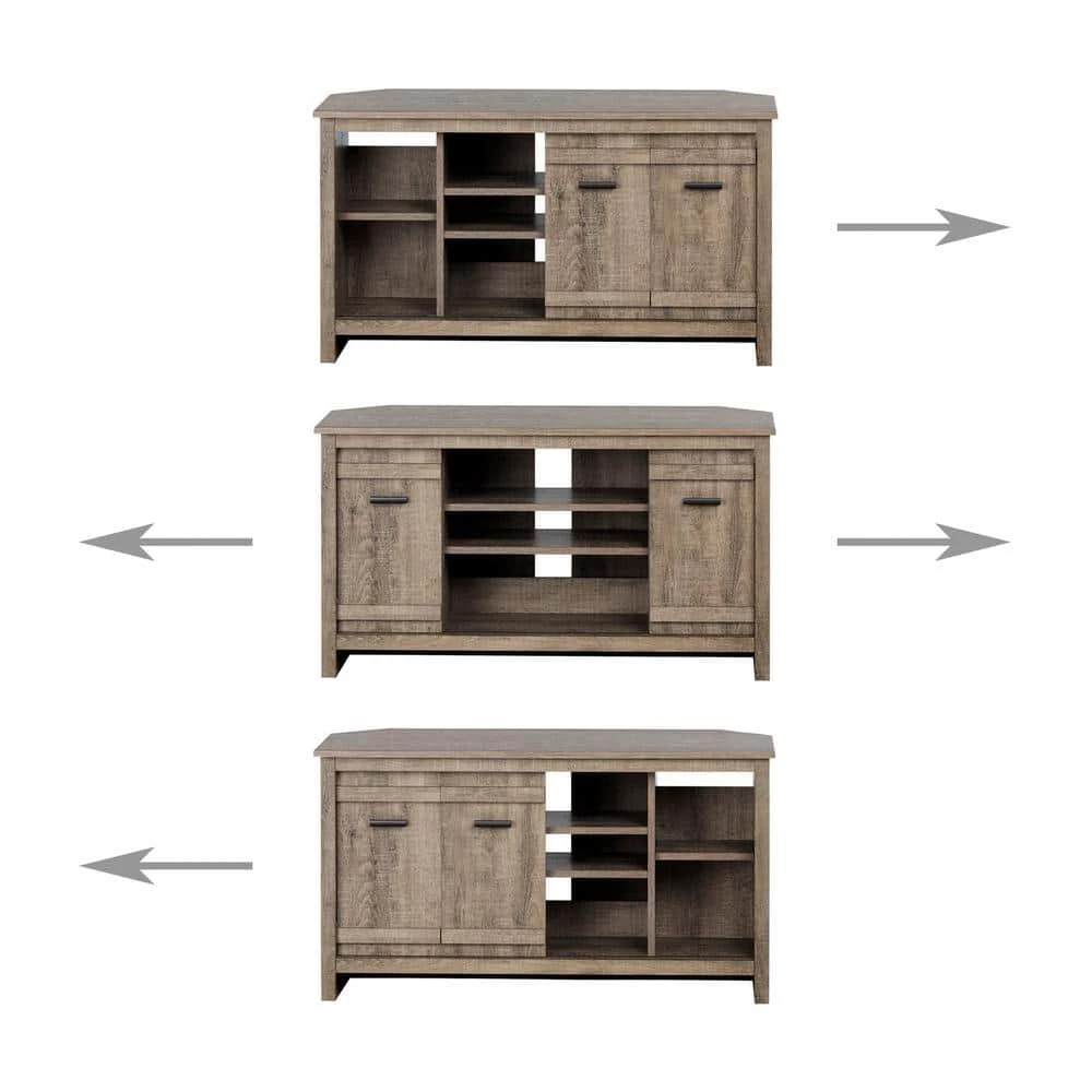 This TV stand, with its corner configuration, features a wide range of open and closed storage options that give you all the space you need for your electronics. Its clean, contemporary and functional aesthetic will really help enhance your living-room. TV and accessories not included.