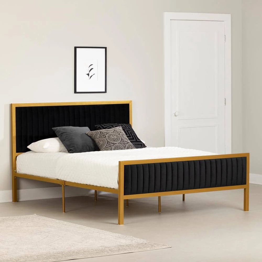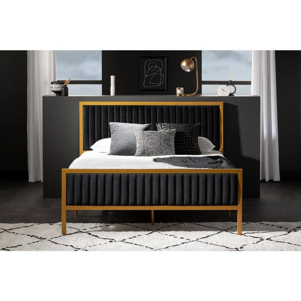 This padded bed.on legs is just the thing for.fans of the glam trend. We love the contrast between the metal frame and padding, which calls to mind the furniture in high-end hotels. The velvet on the headboard and footboard adds a luxurious yet cozy touch that’ll give your master bedroom.a sophisticated look. For an even more deluxe appearance, we suggest you combine it with gold accessories and rich colors. We’re sure our Maliza bed base will steal the show in your bedroom.This is a frame of superior quality, with a seductive style. The headboard and footboard are included, which saves you hours of extra shopping. It’s also made of wooden slats, so your mattress will be quite stable. We’ve even added extra legs under the base, for added sturdiness – no risk of a creaky bed.after just a few days.