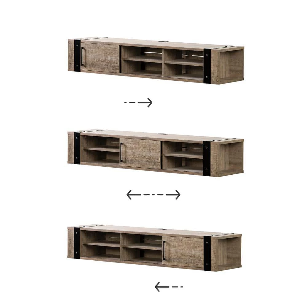 – An Industrial look TV stand -The clean lines of this wall mounted TV stand make it ideal for a minimalist style living room or family room. To highlight the Industrial design, we added a metal handle and contrasting metal brackets. The simple yet versatile finish blends easily with any contemporary decor. – Storage for your living room -This TV stand has three adjustable shelves, designed to hold electronics, a sound system, consoles, as well as DVD and Blu-ray players. Use the sliding door to hide anything youd rather keep out of sight or beyond the kids reach. The two open storage spaces are just right for books, magazines, DVDs and video games. – Well thought out down to the last detail -The hole in back makes it easy to manage the wiring for your electronics, DVD player, video game consoles and TV. No more trailing, tangled cords. This unit, which has to be wall mounted, was designed to store your equipment not to hold a TV. Ideally your TV should be a 75 in. Screen or less. – 5-year limited guarantee -South Shore is proud to stand behind this 68 in. wall mounted media console with an exclusive 5-year limited guarantee. Assembly is required by 2 adults and tools are not included. If you have questions regarding this product or need assistance do not hesitate to contact South Shore Furniture 7 days support. This product is made in North America with laminated particleboard. TV and accessories not included.