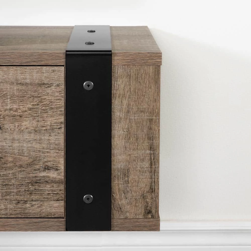 - Industrial accents: the metal handle and two decorative metal brackets add an industrial touch to this wall mounted TV stan