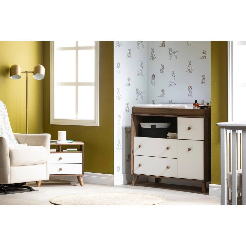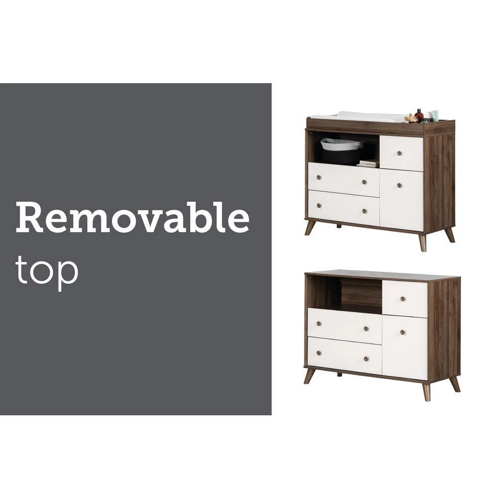A changing table designed with the nursery in mind -This versatile changing table has a removable top, so you can easily turn it into a chest and adapt it as your kid gets older. Its ASTM certified and meets current standards, to ensure your little treasure is safe. – Ample storage -We designed this changing table so every aspect from A to Z gives you handy storage to the max. The two drawers on the left are big enough to hold all your babys clothes and bedding. The top drawer is great for accessories, while the one on the right is the perfect size for large packs of diapers. What about some baskets for the open space at the top, Now tHere is an attractive way to keep things organized. – Scandinavian design -We were inspired by the Nordic spirit when designing the Yodi collection, which helped us create a relaxing atmosphere. The wood style finish, combined with a contrasting facade, adds a touch of warmth while the clean lines are accented by the angled legs and cone shaped handles, both made of wood. Go for the complete look choose other furniture from the collection. – 5-year limited guarantee -South Shore is proud to stand behind this changing table with drawers and open storage with an exclusive 5-year limited guarantee. There is a wall anchor kit included in the box to prevent tip-over incidents, thus ensuring your family’s safety. This product is made in North America with mdf and Laminated particleboard. Mattress and accessories not included.
