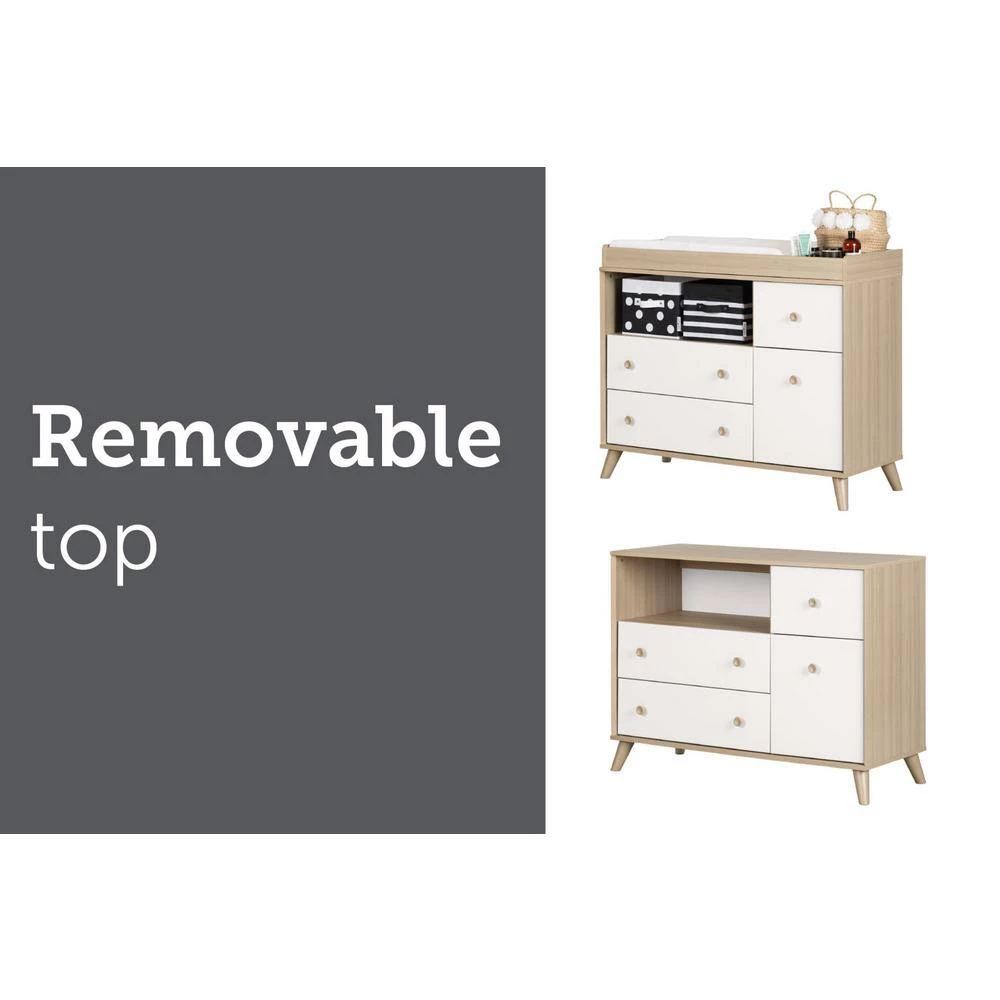 – A changing table designed with the nursery in mind -This versatile changing table has a removable top, so you can easily turn it into a chest and adapt it as your kid gets older. Its ASTM certified and meets current standards, to ensure your little treasure is safe. – Ample storage -We designed this changing table so every aspect from A to Z gives you handy storage to the max. The two drawers on the left are big enough to hold all your babys clothes and bedding. The top drawer is great for accessories, while the one on the right is the perfect size for large packs of diapers. What about some baskets for the open space at the top, Now tHere is an attractive way to keep things organized. – Scandinavian design -We were inspired by the Nordic spirit when designing the Yodi collection, which helped us create a relaxing atmosphere. The wood style finish, combined with a contrasting facade, adds a touch of warmth while the clean lines are accented by the angled legs and cone shaped handles, both made of wood. Go for the complete look choose other furniture from the collection. – 5-year limited guarantee -South Shore is proud to stand behind this changing table with drawers and open storage with an exclusive 5-year limited guarantee. There is a wall anchor kit included in the box to prevent tip-over incidents, thus ensuring your family’s safety. This product is made in North America with mdf and Laminated particleboard. Mattress and accessories not included.