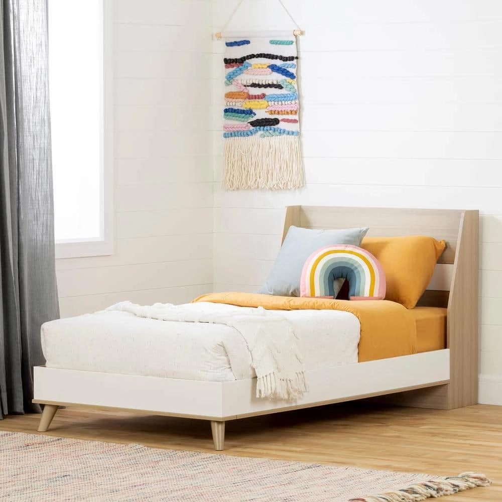 A complete bed set -So you have to furnish a room but wouldn’t it be nice to save a little money too, Here is a great idea: a set that includes both bed and headboard. Everything’s right there. Another plus: you don’t need a box spring. The mattress goes directly on the base and you can enjoy a sound sleep. – A warm minimalist design -This bed combines the warmth of a wood style finish with contrasting accents, so any bedroom will have a Scandinavian feel. The angled wooden legs give the bed character, while the angle cut sides of the headboard add that certain something that makes it oh-so-cozy. – 5-year limited guarantee -South Shore is proud to stand behind this bed set – platform bed and headboard kit with an exclusive 5-year limited guarantee. Shop with confidence knowing your purchase is always covered. South Shore beds can support a weight capacity of 250 lb. for a twin size bed and 500 lb. for a full, queen and king size bed. All our products meets or exceeds North American safety standards and our packaging are tested and certified to reduce the risk of damage during shipment. This item is shipped in 2 boxes, make sure to have a friend with you. Assembly is required by 2 adults and tools are not included. If you have questions regarding this product or need assistance do not hesitate to contact South Shore Furniture 7 days support. This product is made in North America with laminated particleboard and MDF. Mattress and accessories not included.